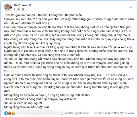 Theo đó, Mèo 2k4 chia sẻ rằng cô rất bất ngờ về chuyện này bởi nó đã diễn ra cách đây 2 năm. Sau đó, cô đã yêu cầu Bé Chanh lên tiếng đính chính và nam streamer này cũng đồng ý. Tuy nhiên cả 2 vẫn chưa xác định rõ đâu là nguồn phát tán clip nhạy cảm của mình.